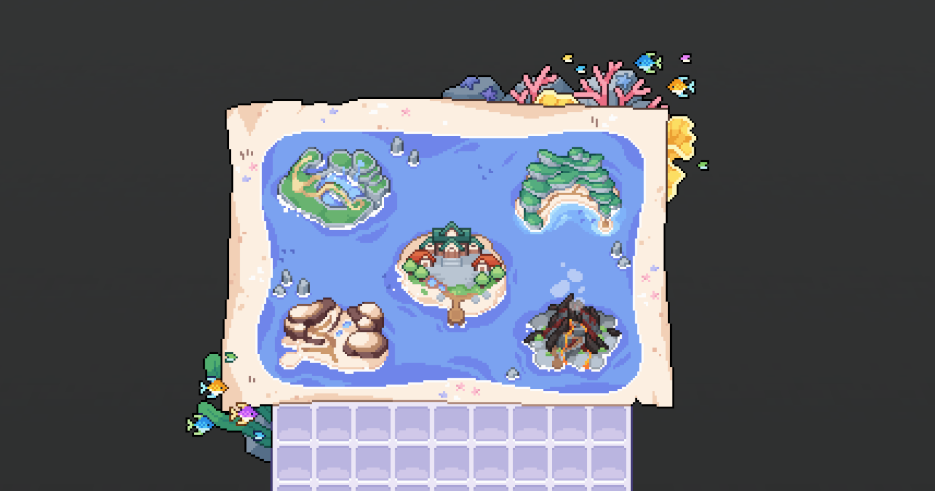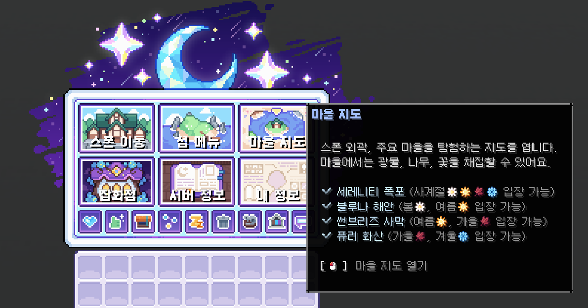 심야잡화점에는 4개의 특별한 마을이 존재합니다. 계절에 따라 입장 가능한 마을이 달라지며, 각 마을에서는 그곳에서만 채집할 수 있는 고유한 특산품이 존재합니다.