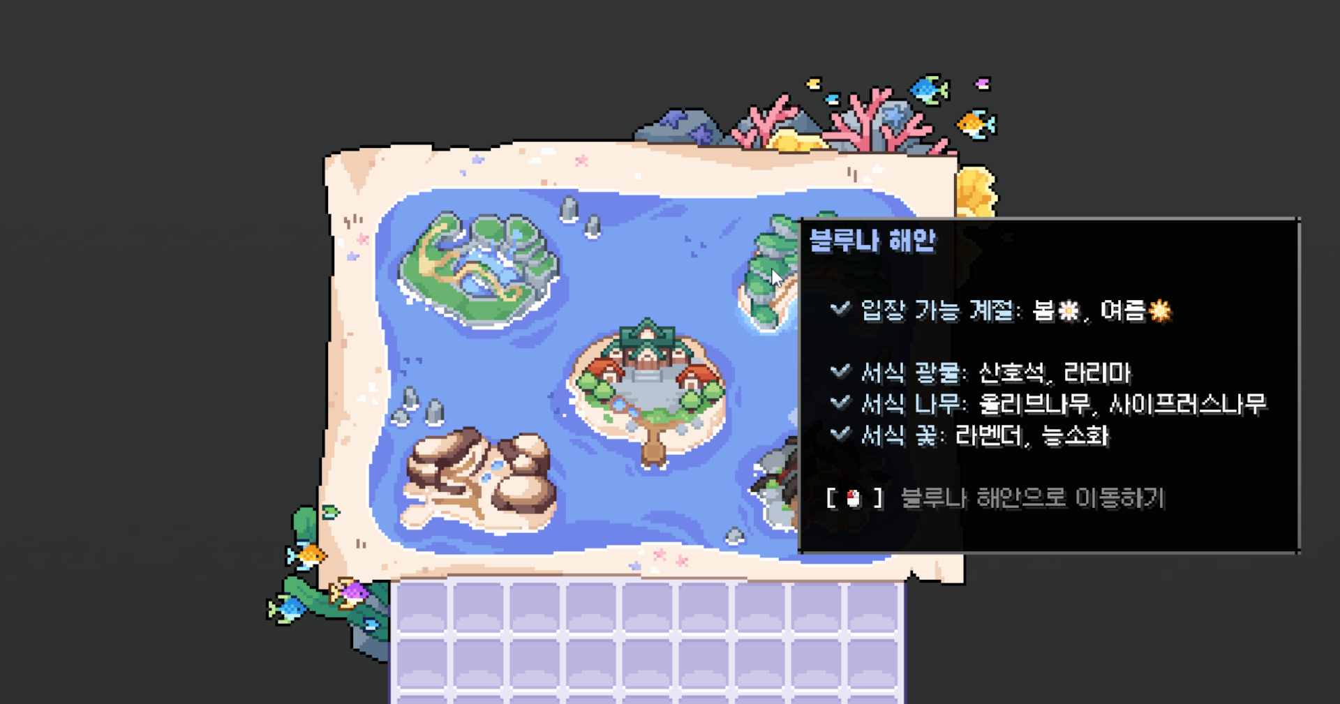 마을 지도에서 섬 위에 마우스를 호버하면, 해당 마을의 정보를 확인할 수 있습니다.