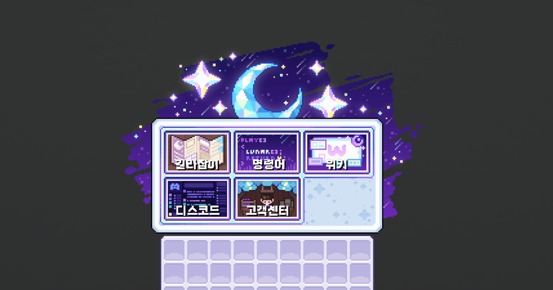 서버 정보 메뉴에서는 길라잡이, 명령어, 위키, 디스코드, 고객센터에 대한 정보를 확인할 수 있습니다. 각 메뉴에 대한 상세 내용은 버튼 클릭 시 채팅으로 안내되는 내용을 확인해 주세요!