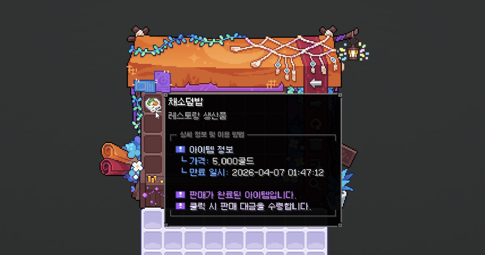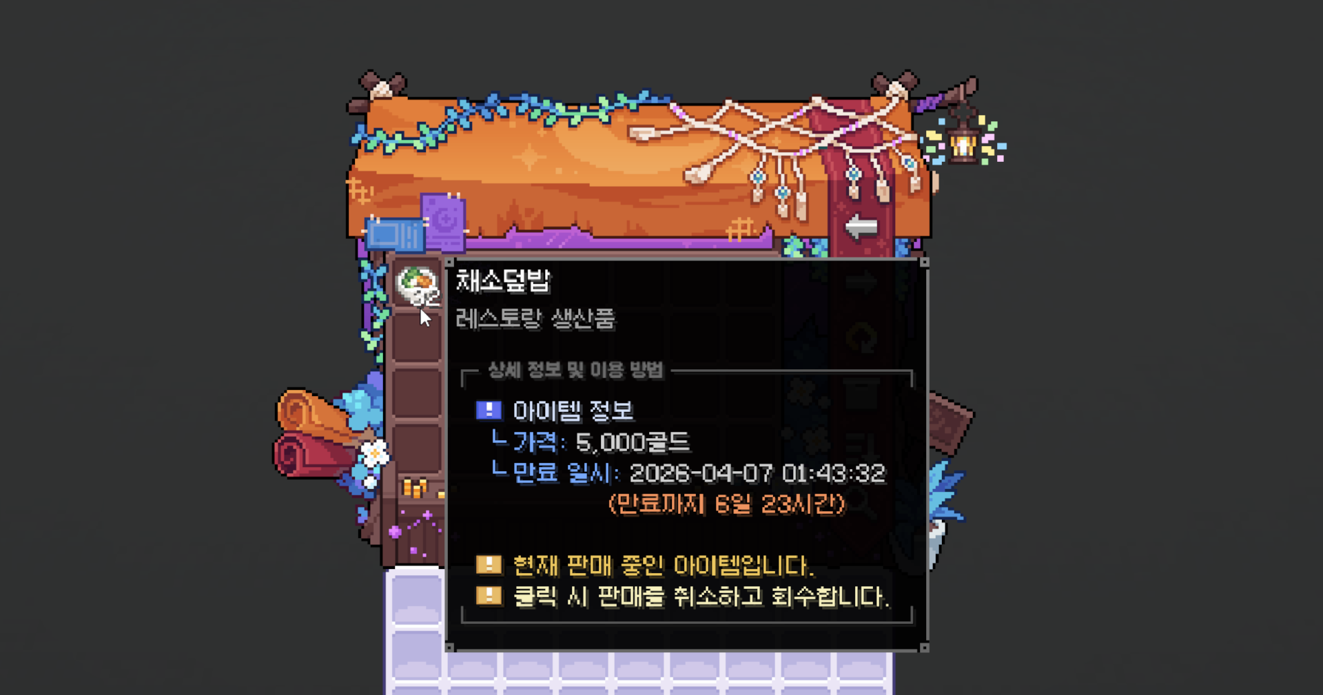 판매 중인 아이템을 좌클릭하면, 판매를 취소하고 인벤토리로 회수합니다.