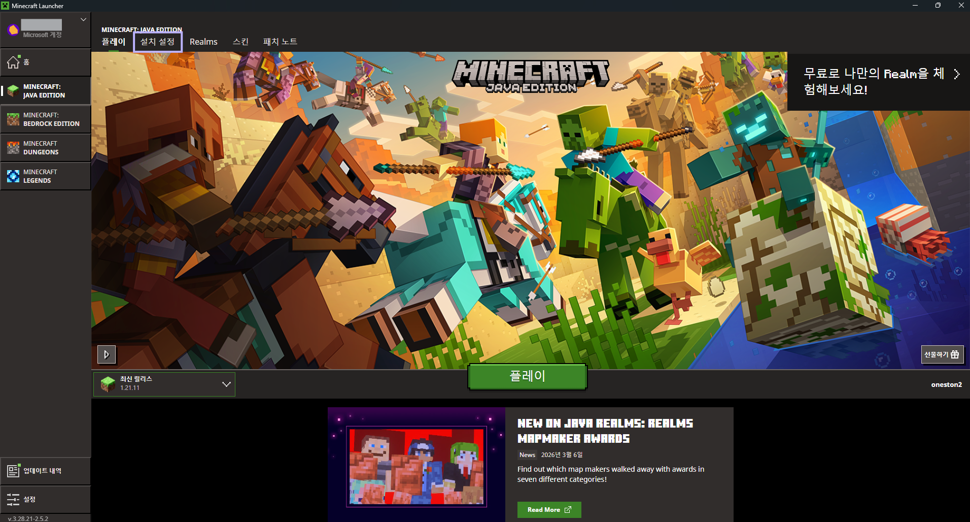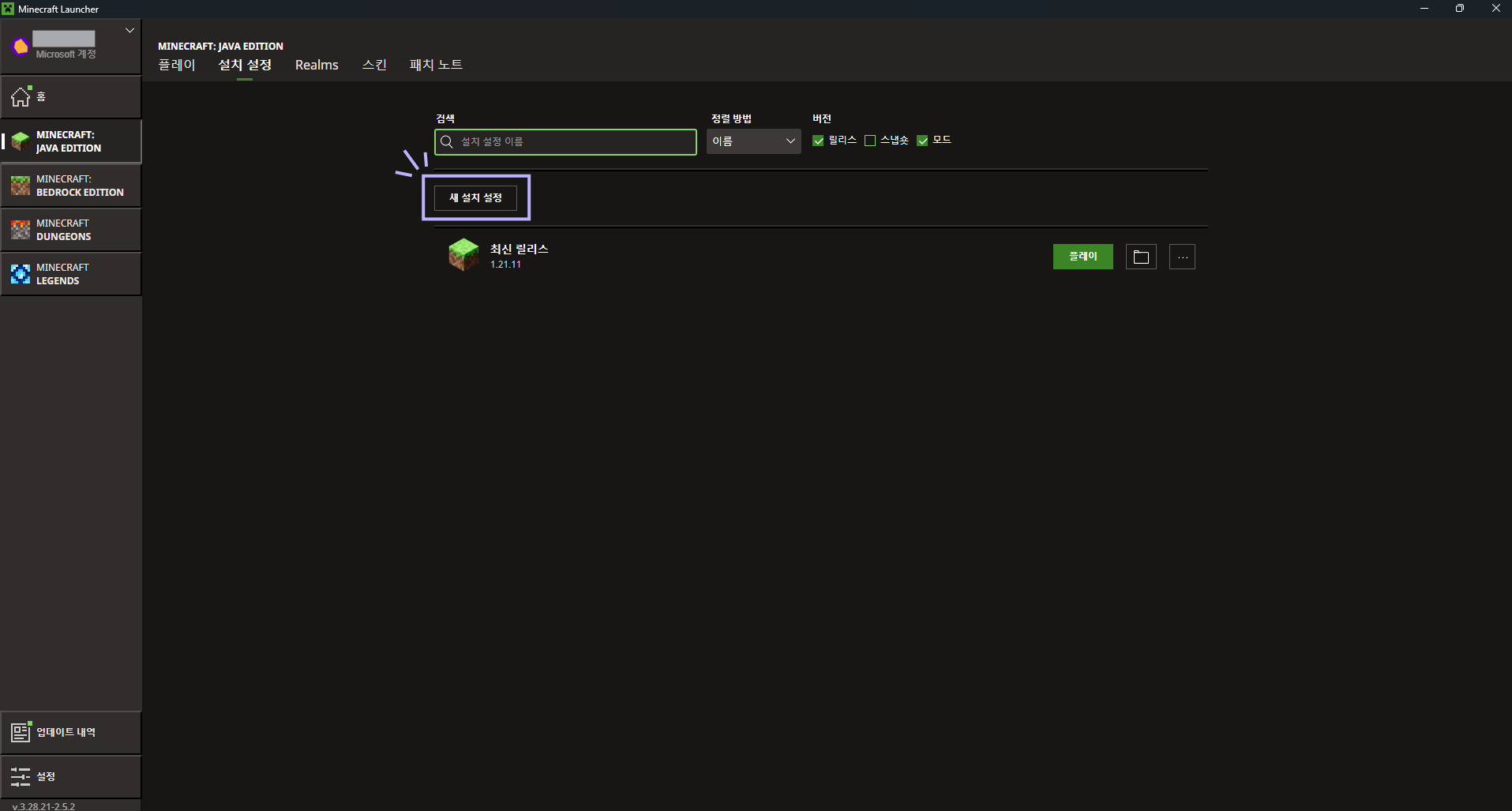 좌측 하단의 현재 런처 버전을 확인합니다.