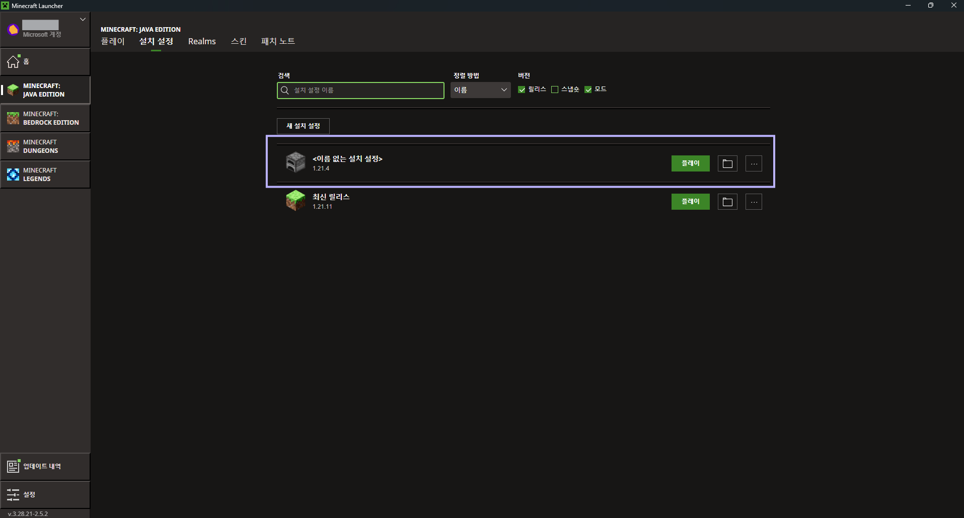 좌측 하단의 Minecraft 1.21.4라는 글자를 확인하여 현재 버전이 1.21.4인지 확인해 주세요. 이곳이 다른 버전이라면, 1.21.4 버전 접속 방법으로 이동해 주세요!