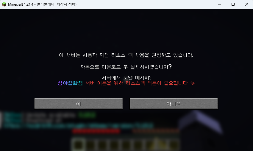 리소스팩 사용을 권장하는 메시지가 뜨면,